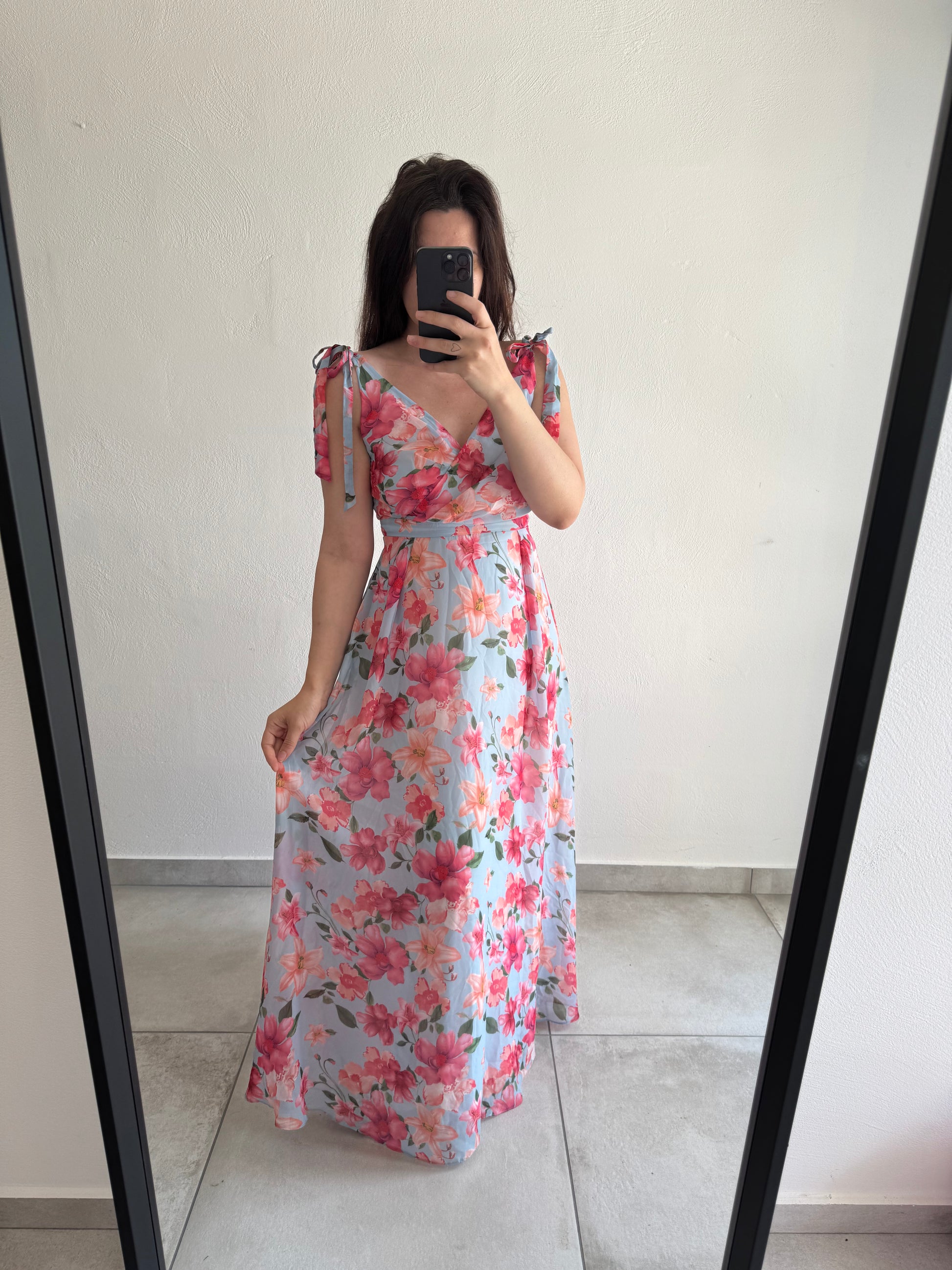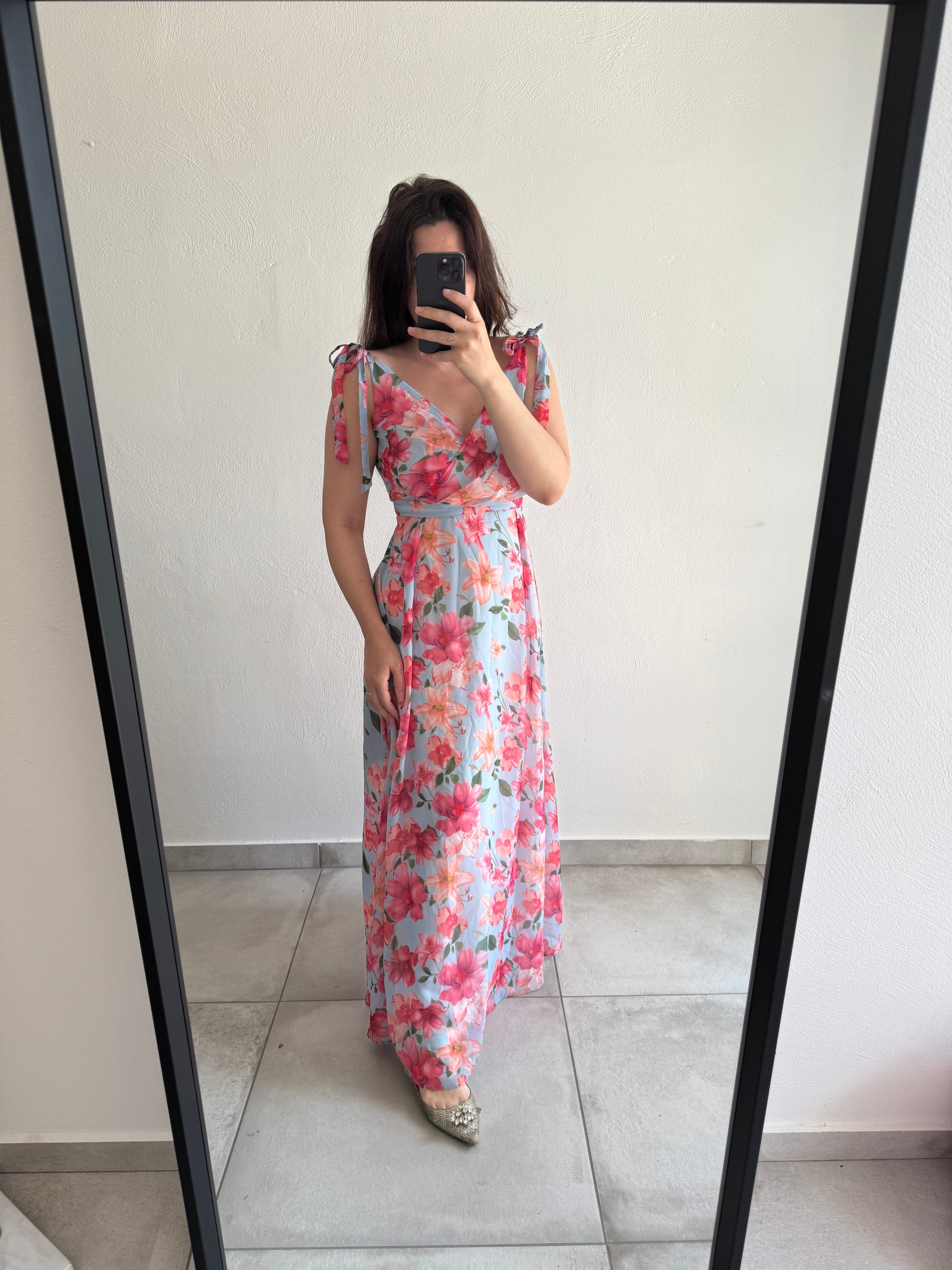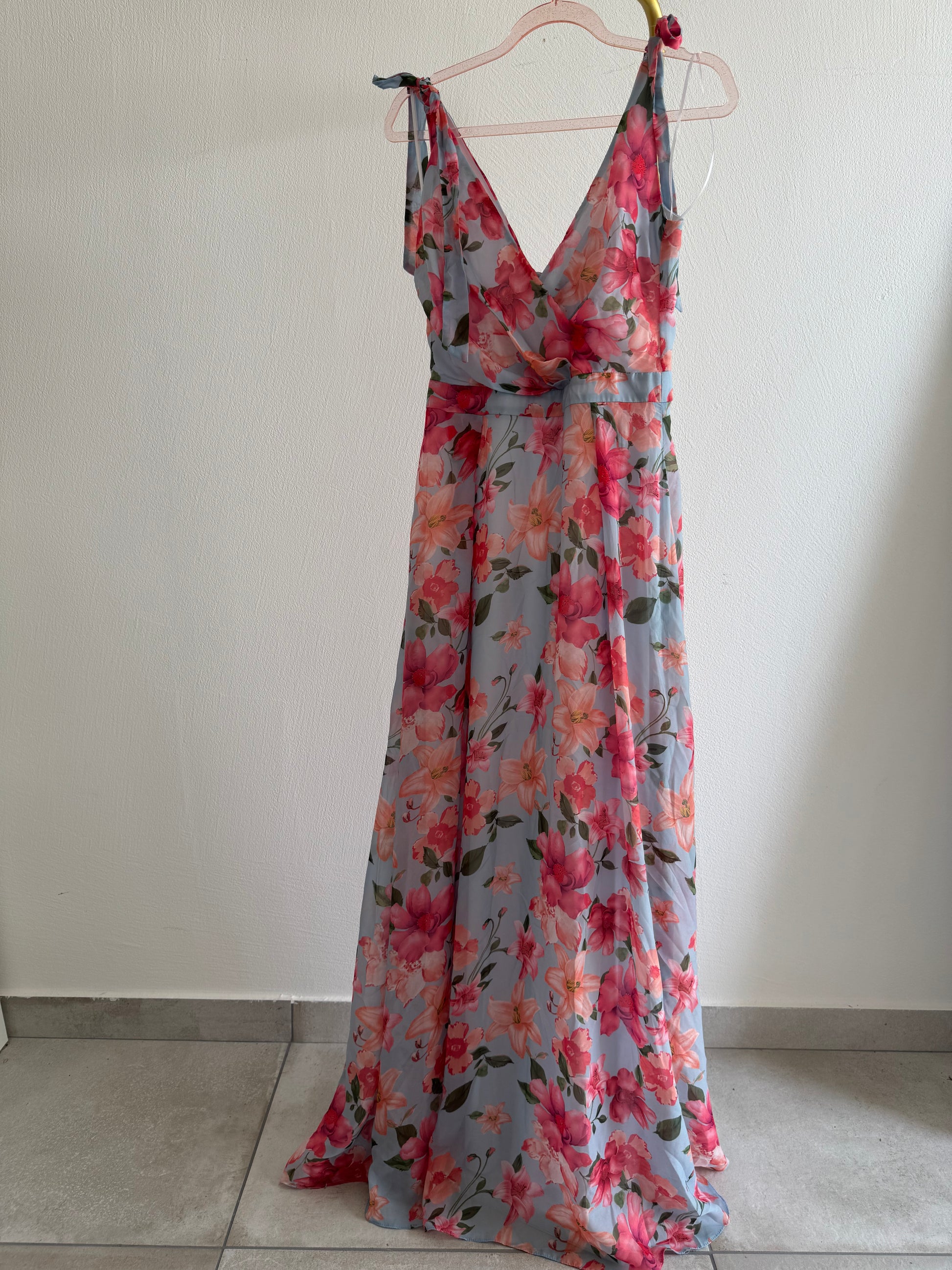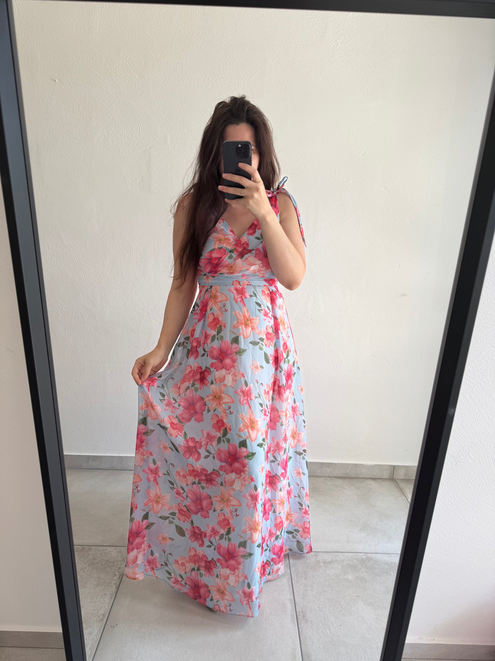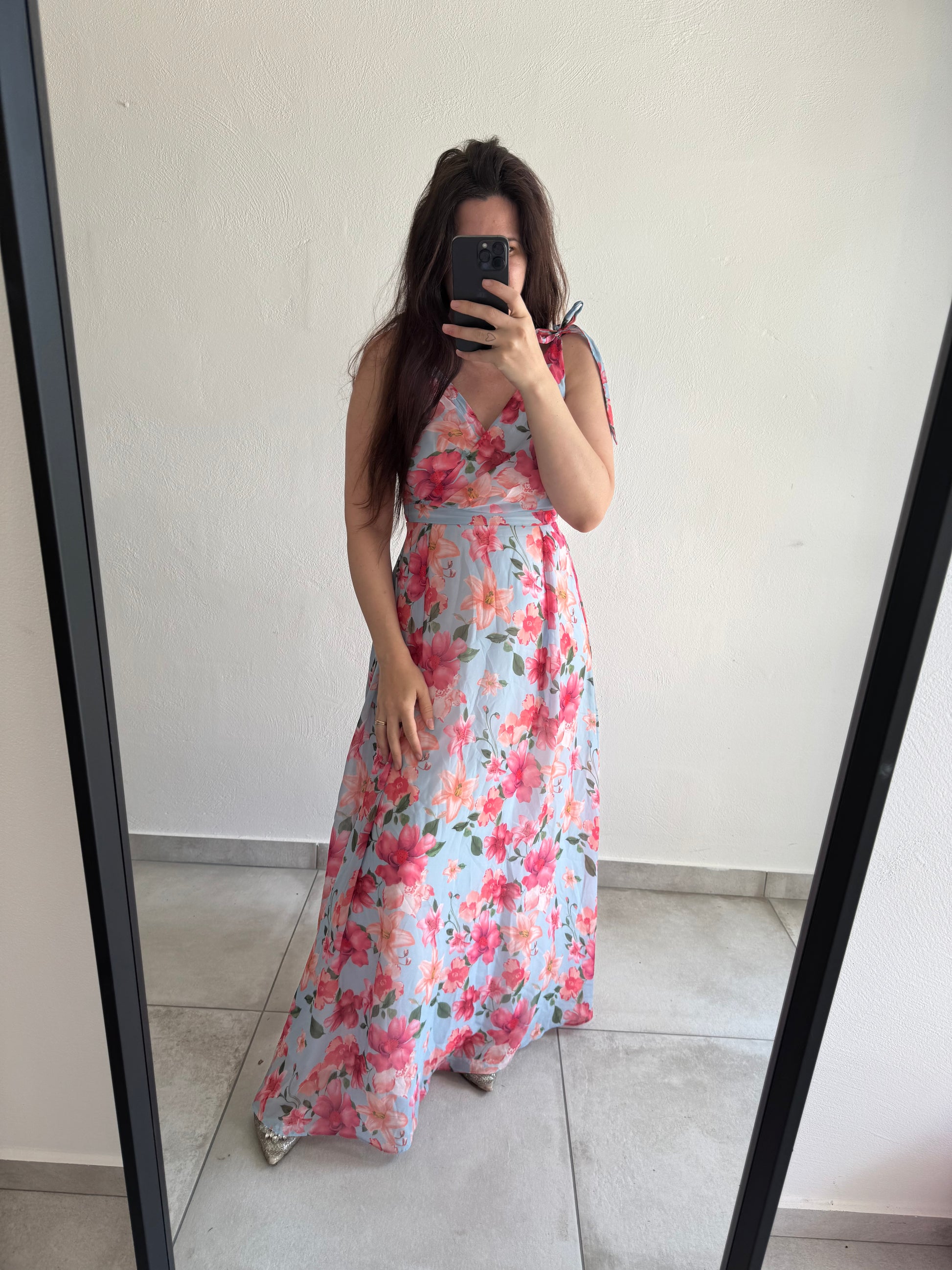 Abito lungo floreale con spalline con laccetto regolabile e fodera all’interno e zip sul retro