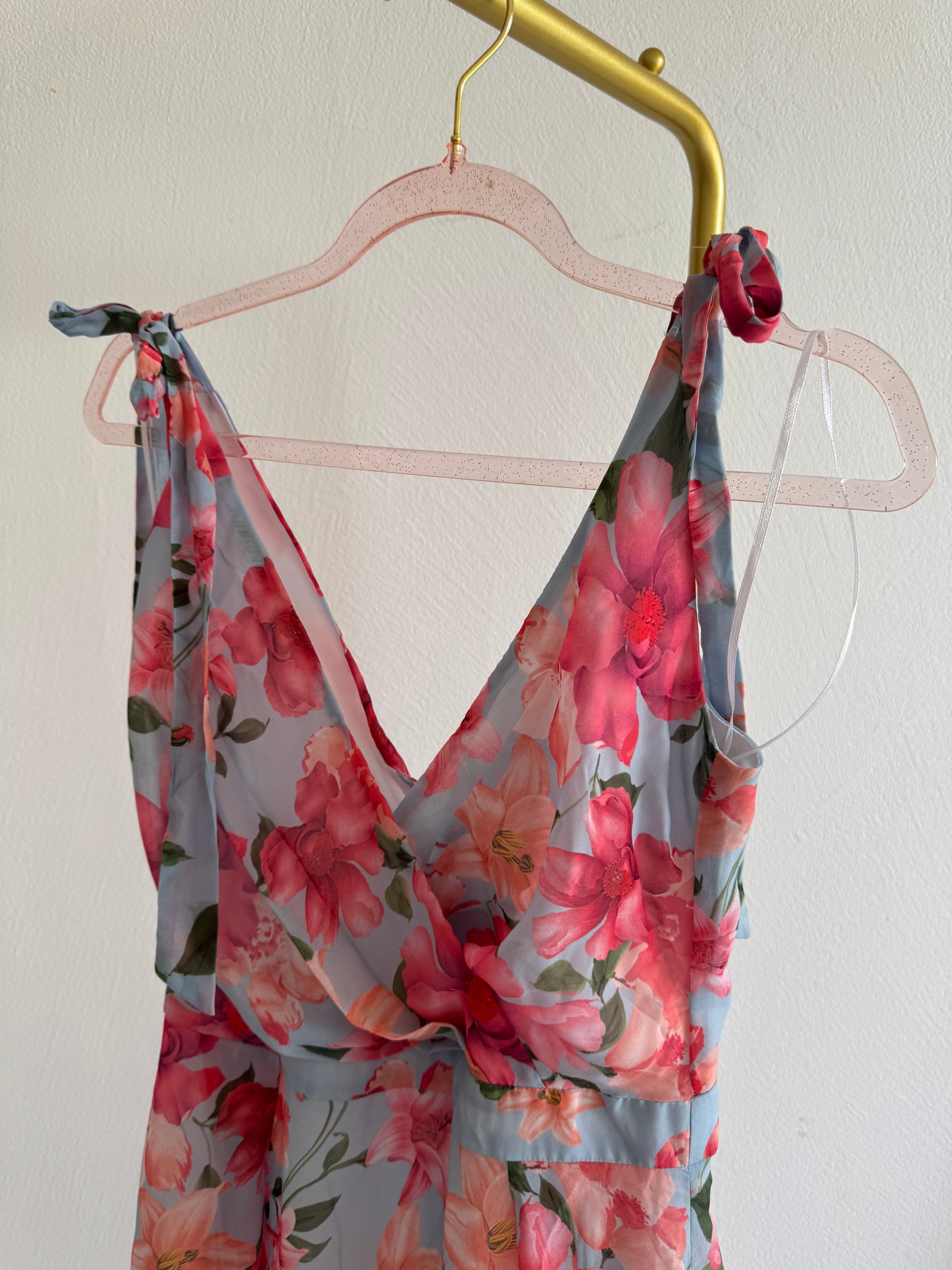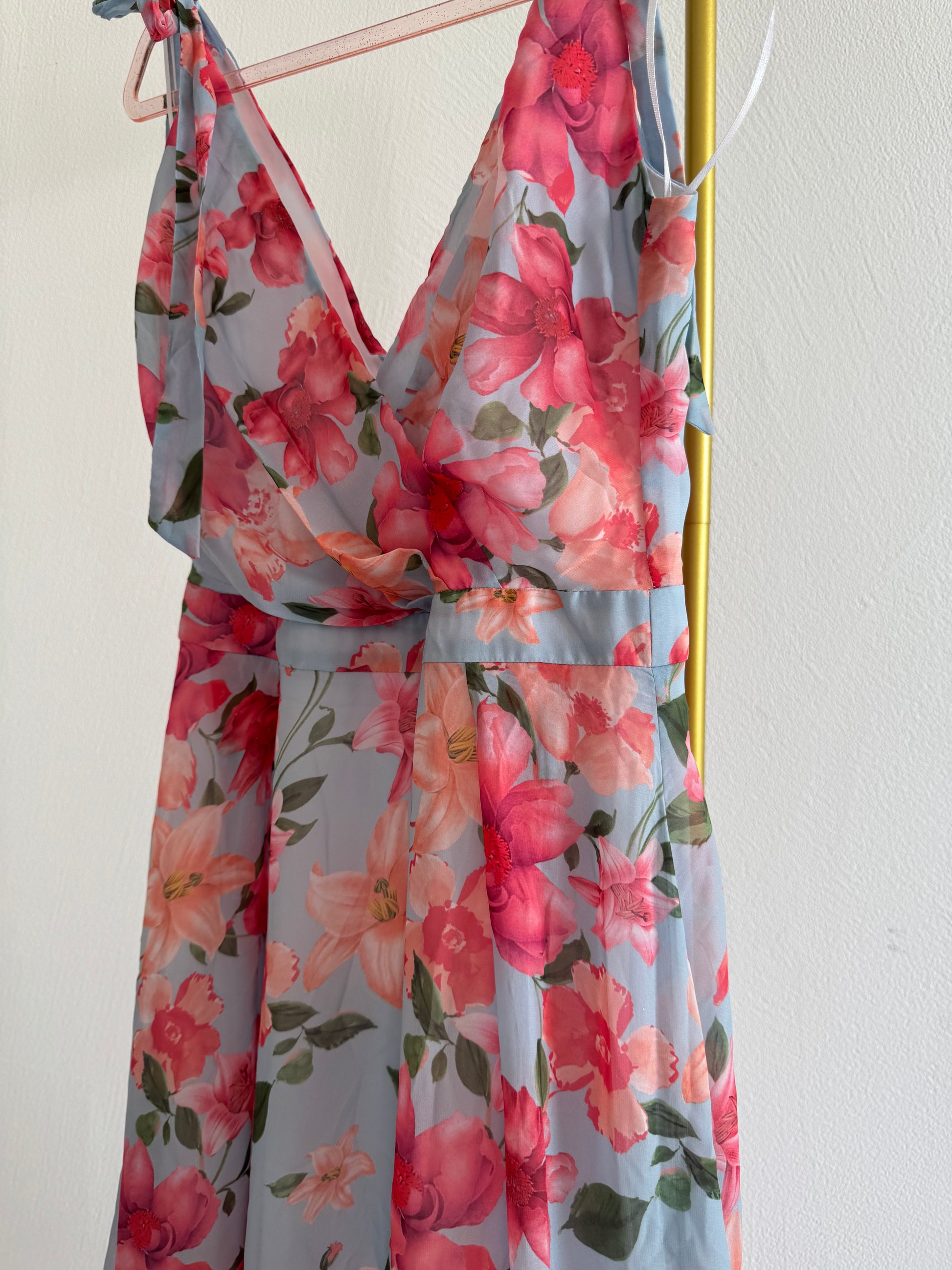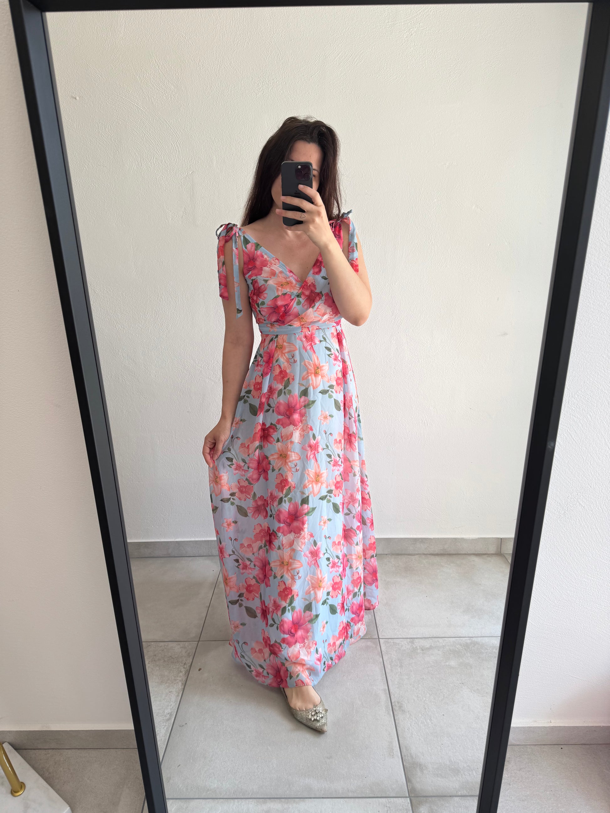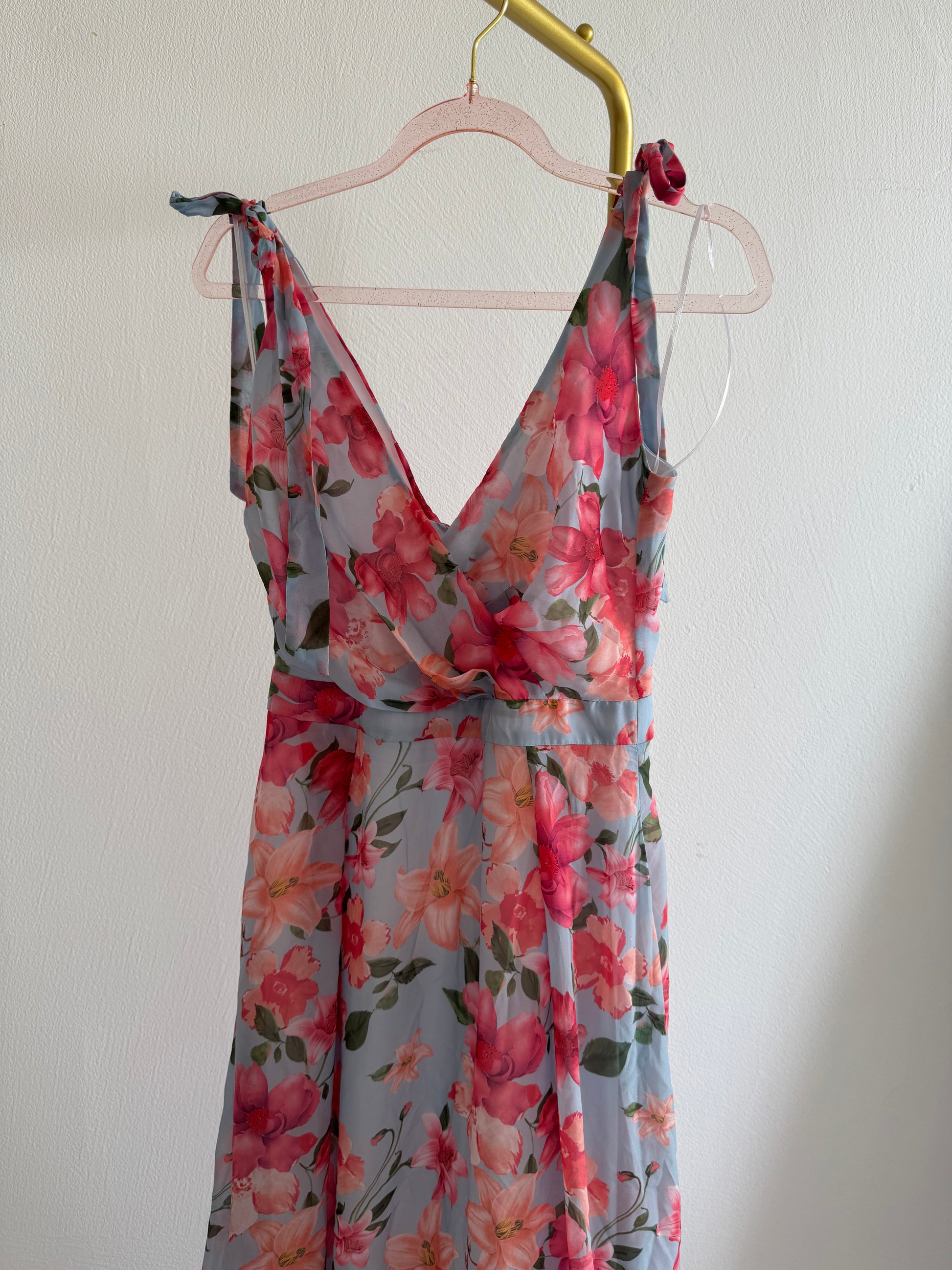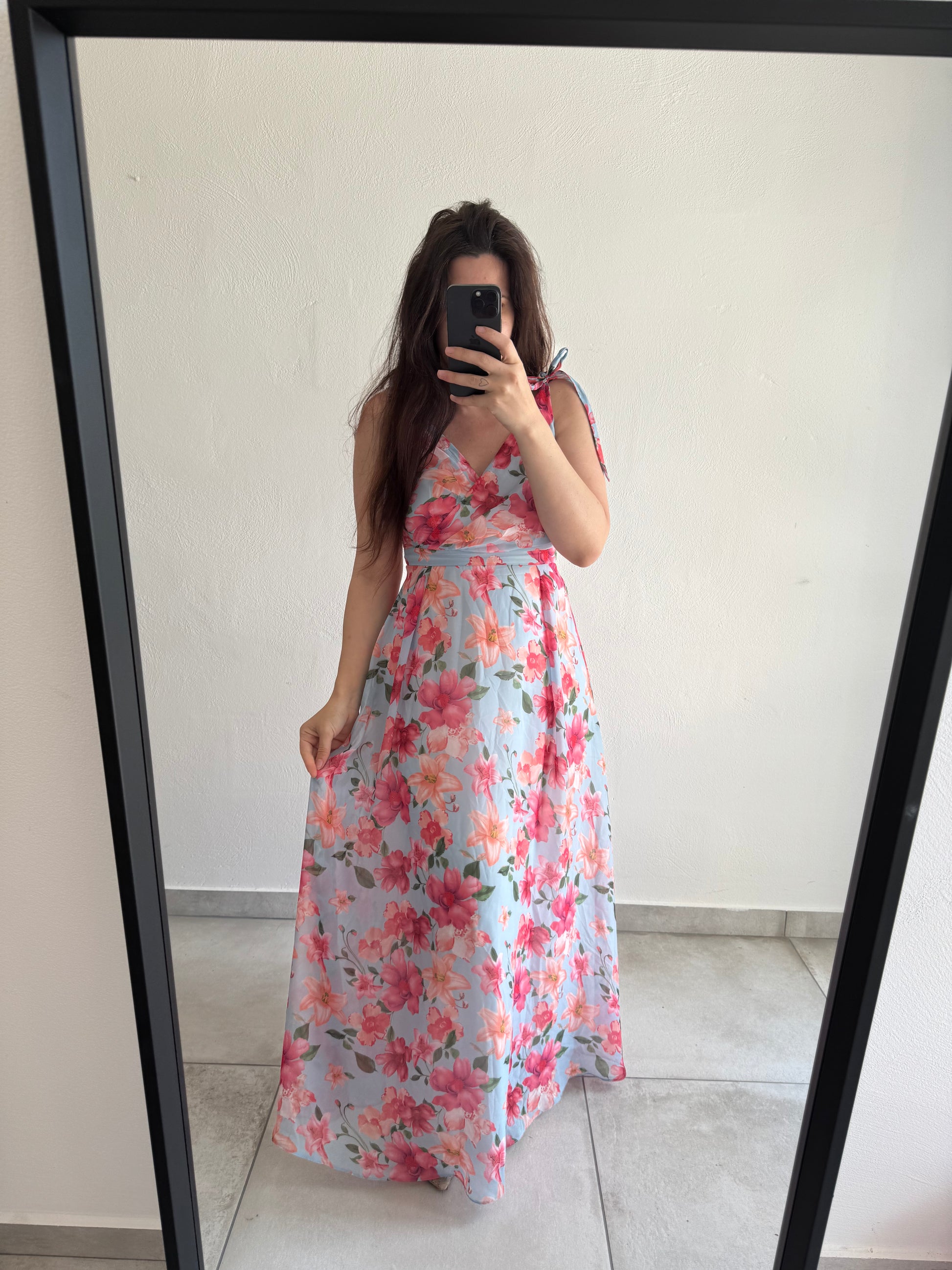 Abito lungo floreale con spalline con laccetto regolabile e fodera all’interno e zip sul retro