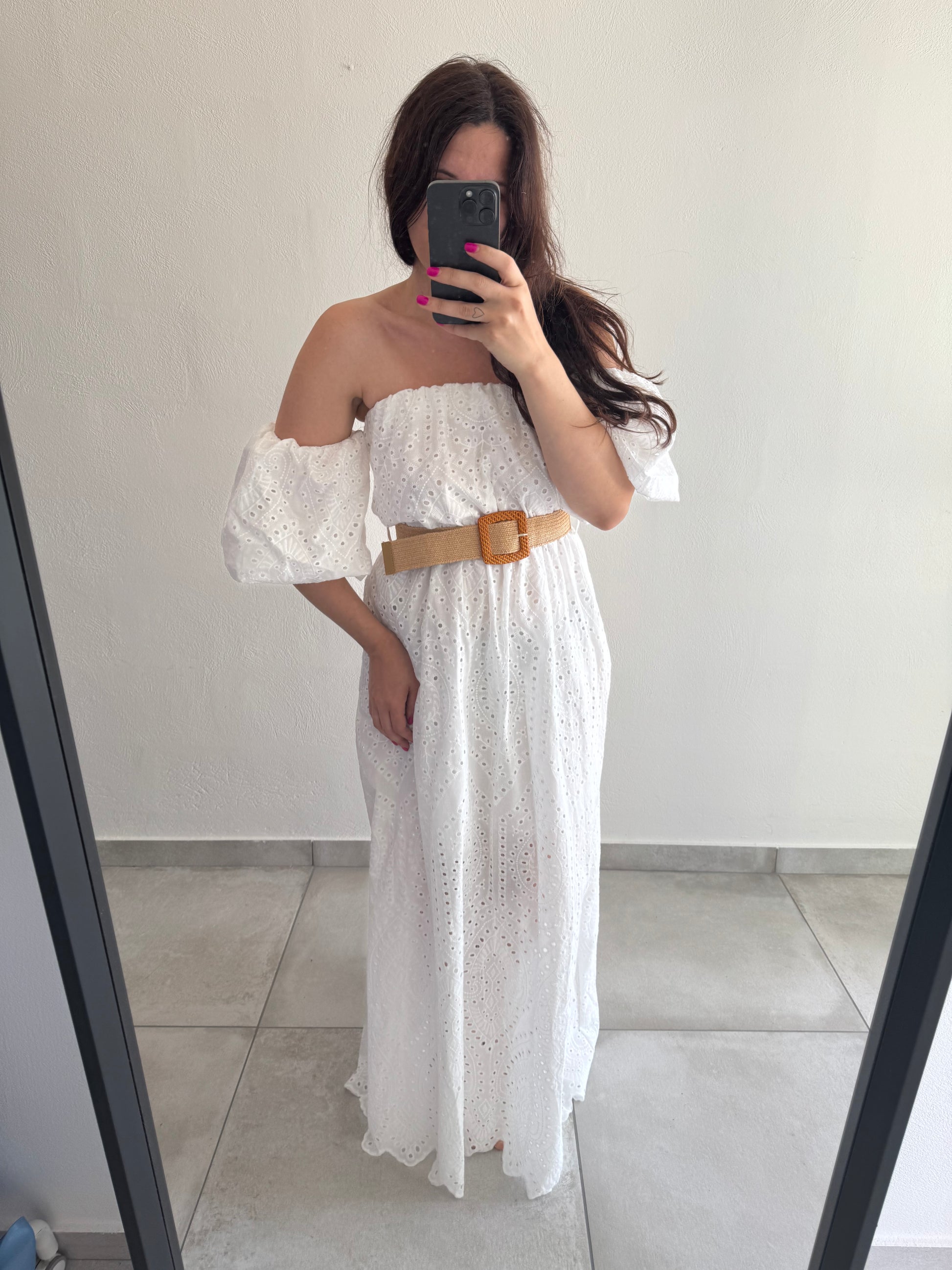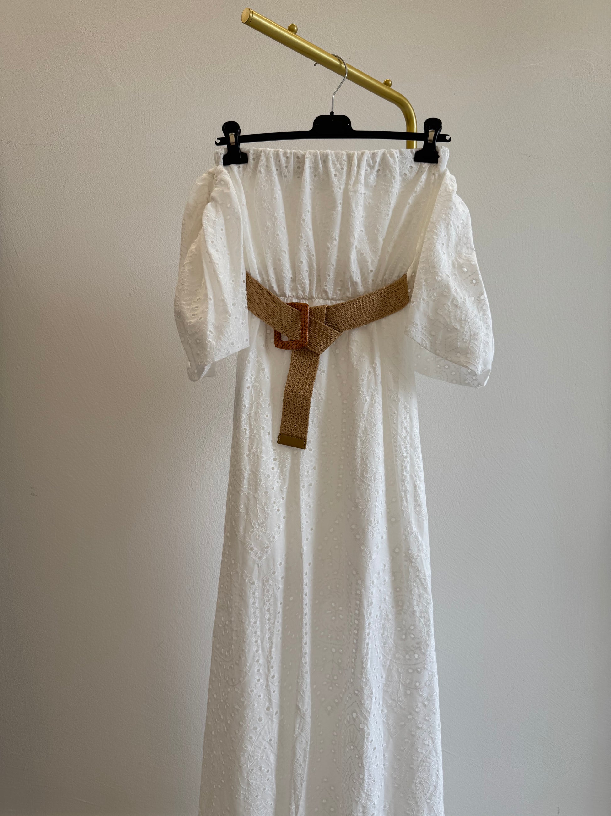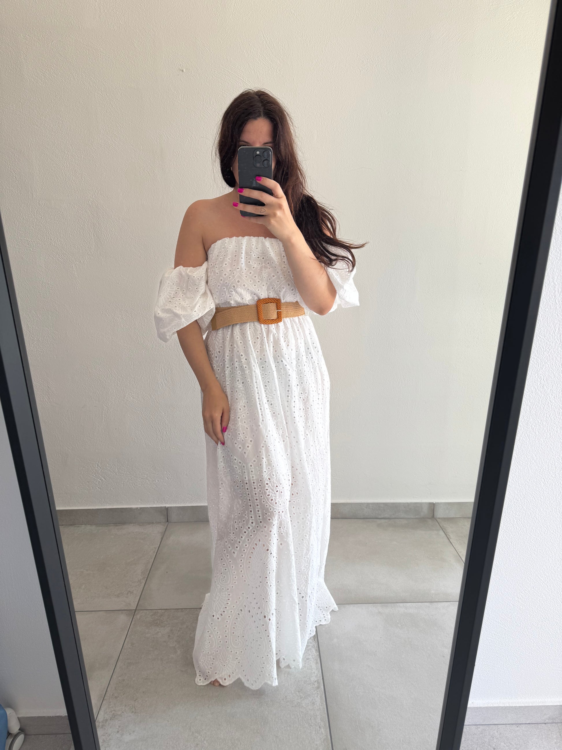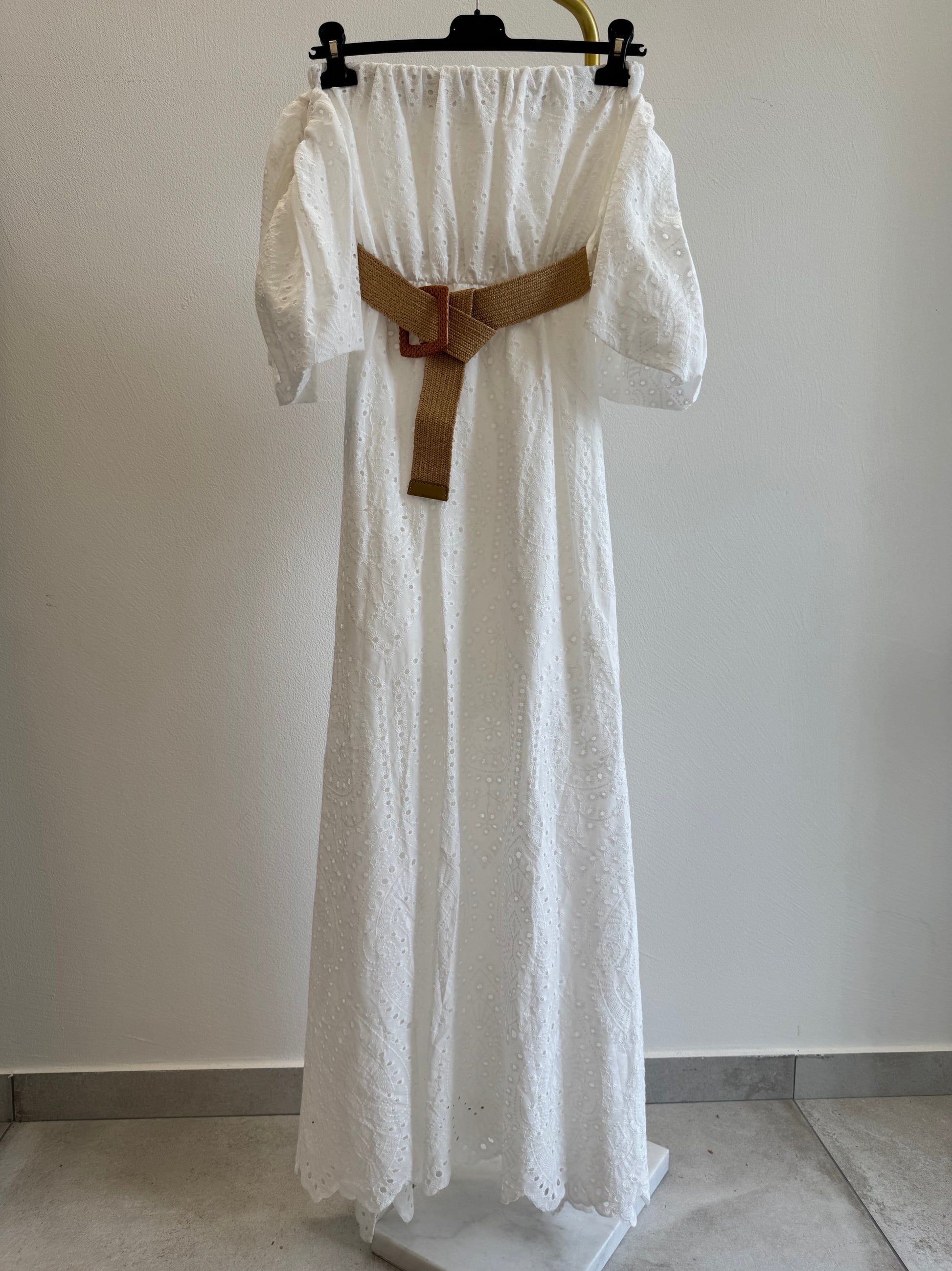 Abito lungo in pizzo sangallo con spalline omerali e cintina