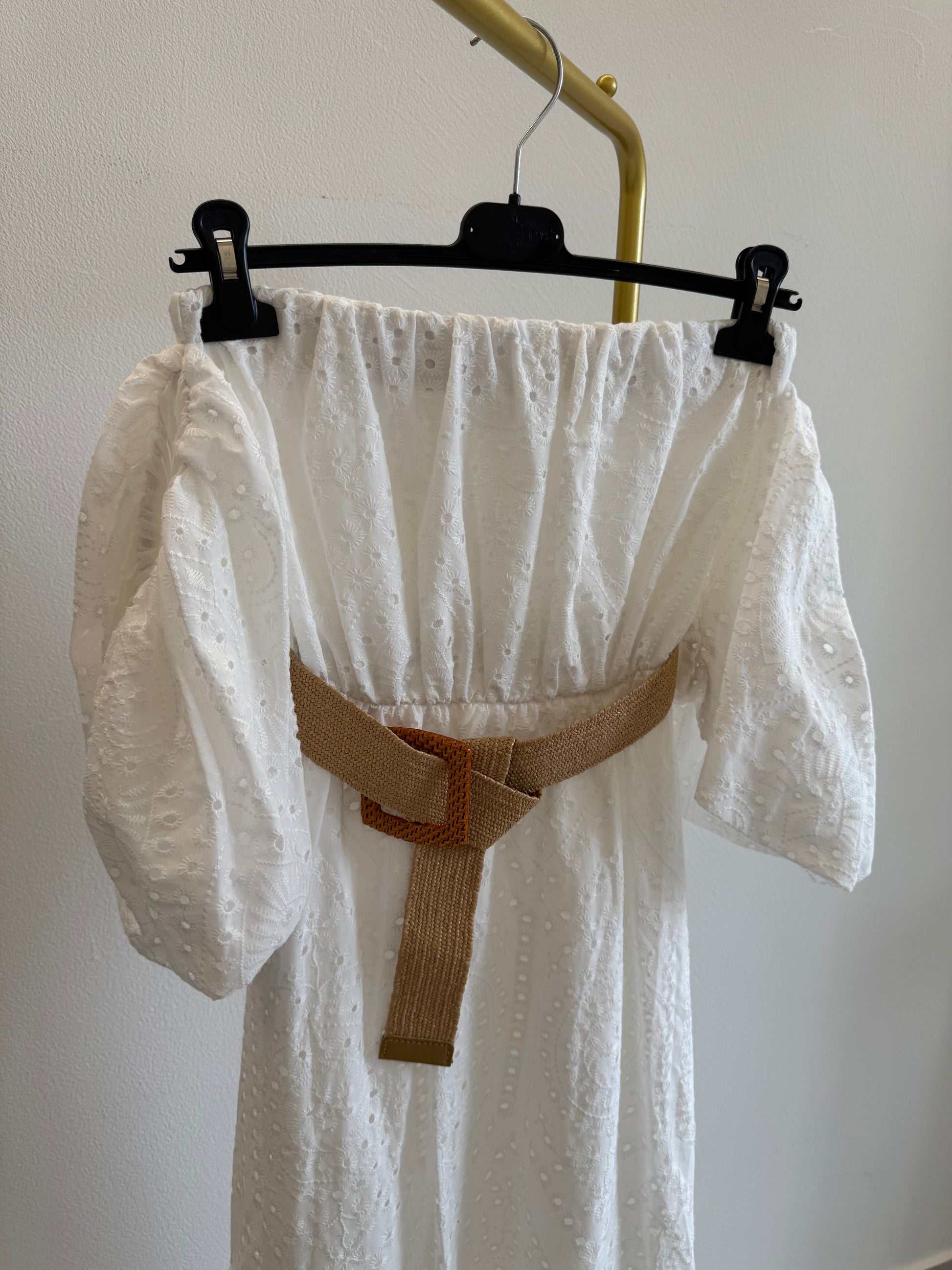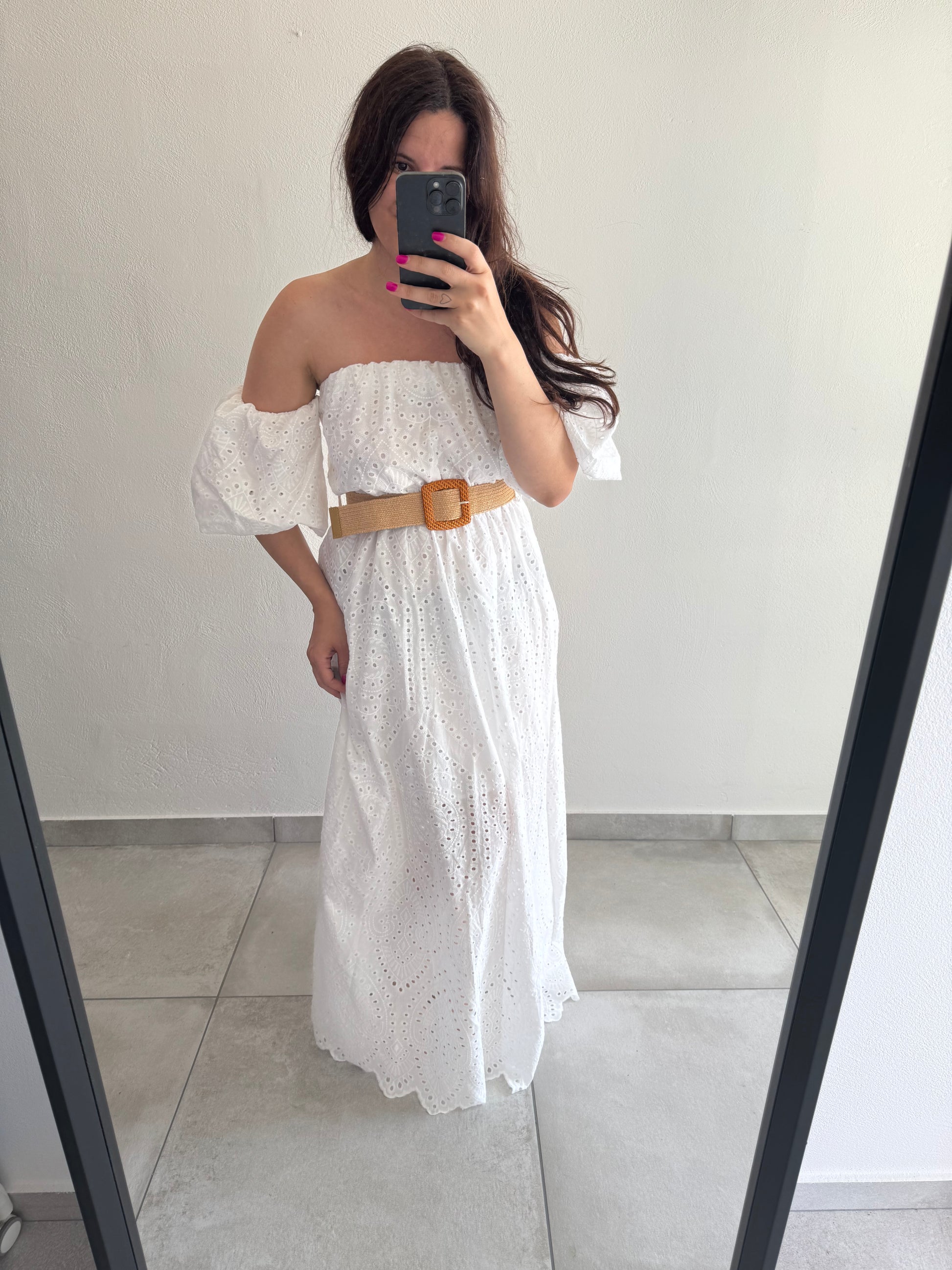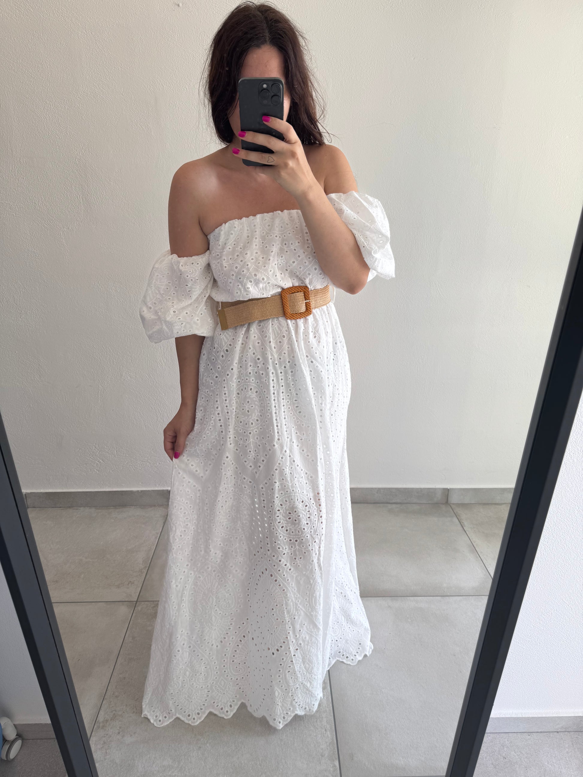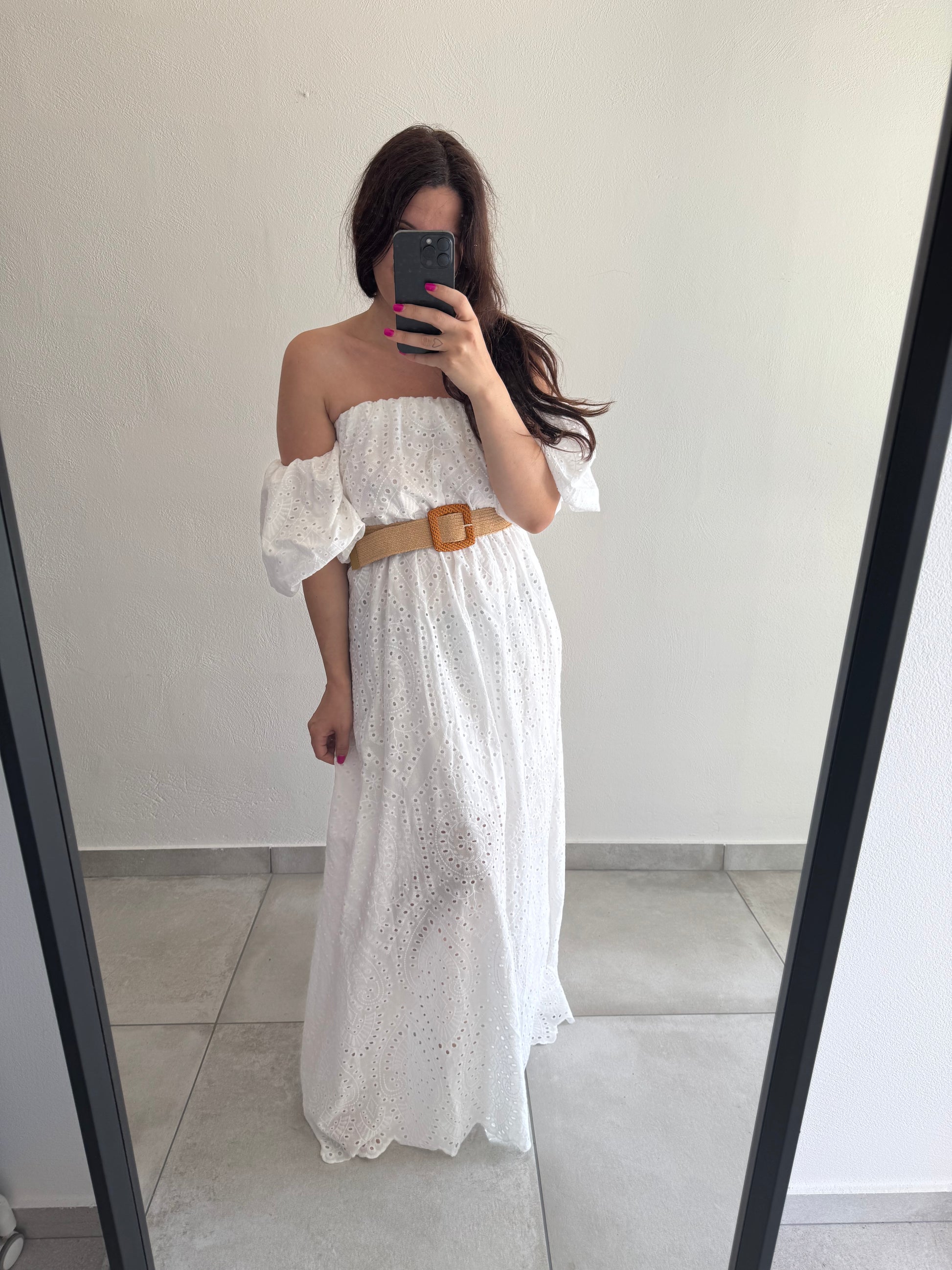 Abito lungo in pizzo sangallo con spalline omerali e cintina