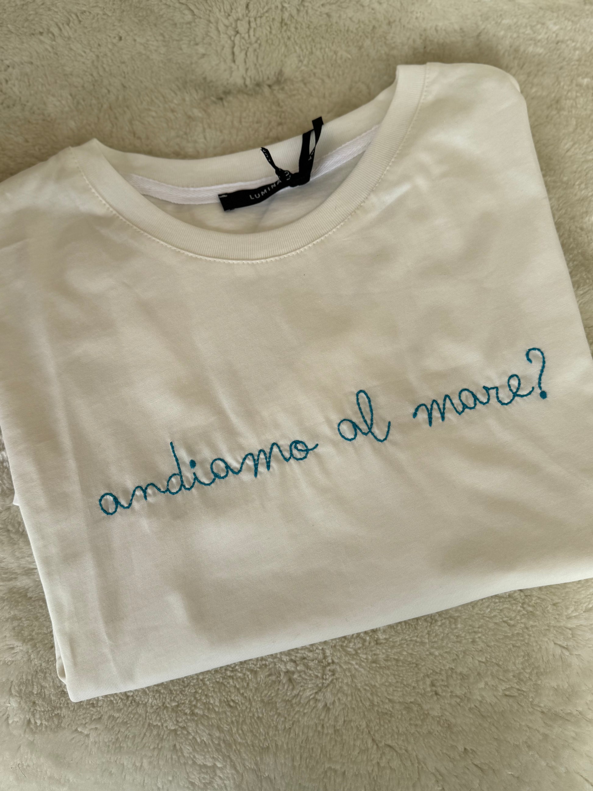 - Con ricamo “Andiamo al mare?” In azzurro chiaro su base bianca